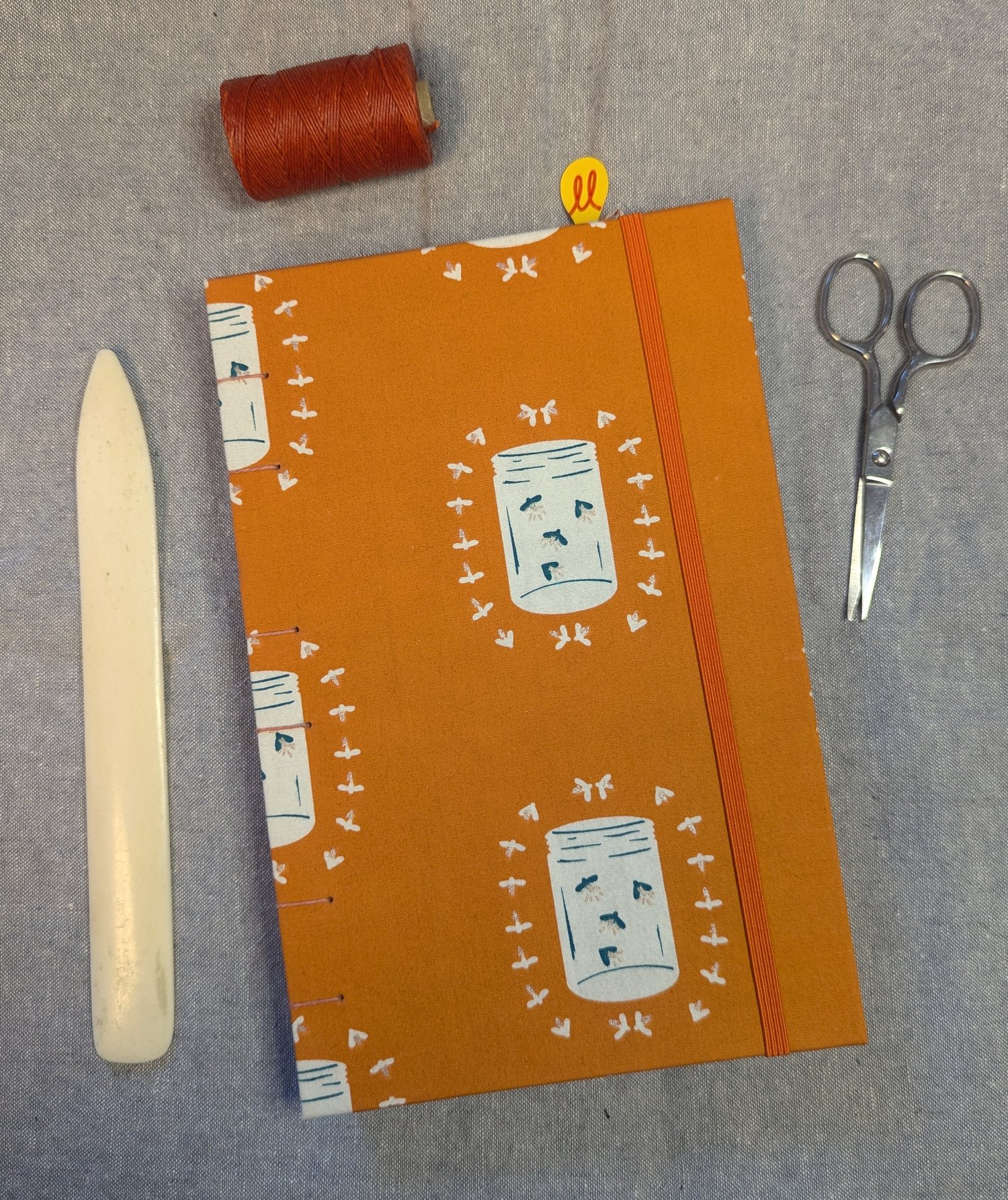 Covered in a beautiful cotton print with coordinating endpapers, this book is bound using a coptic stitch in 100% waxed linen thread that allows the book to not only lay flat but be bent completely back so that both covers lay next to each other. This makes it perfect for artistic uses and comfortable writing.