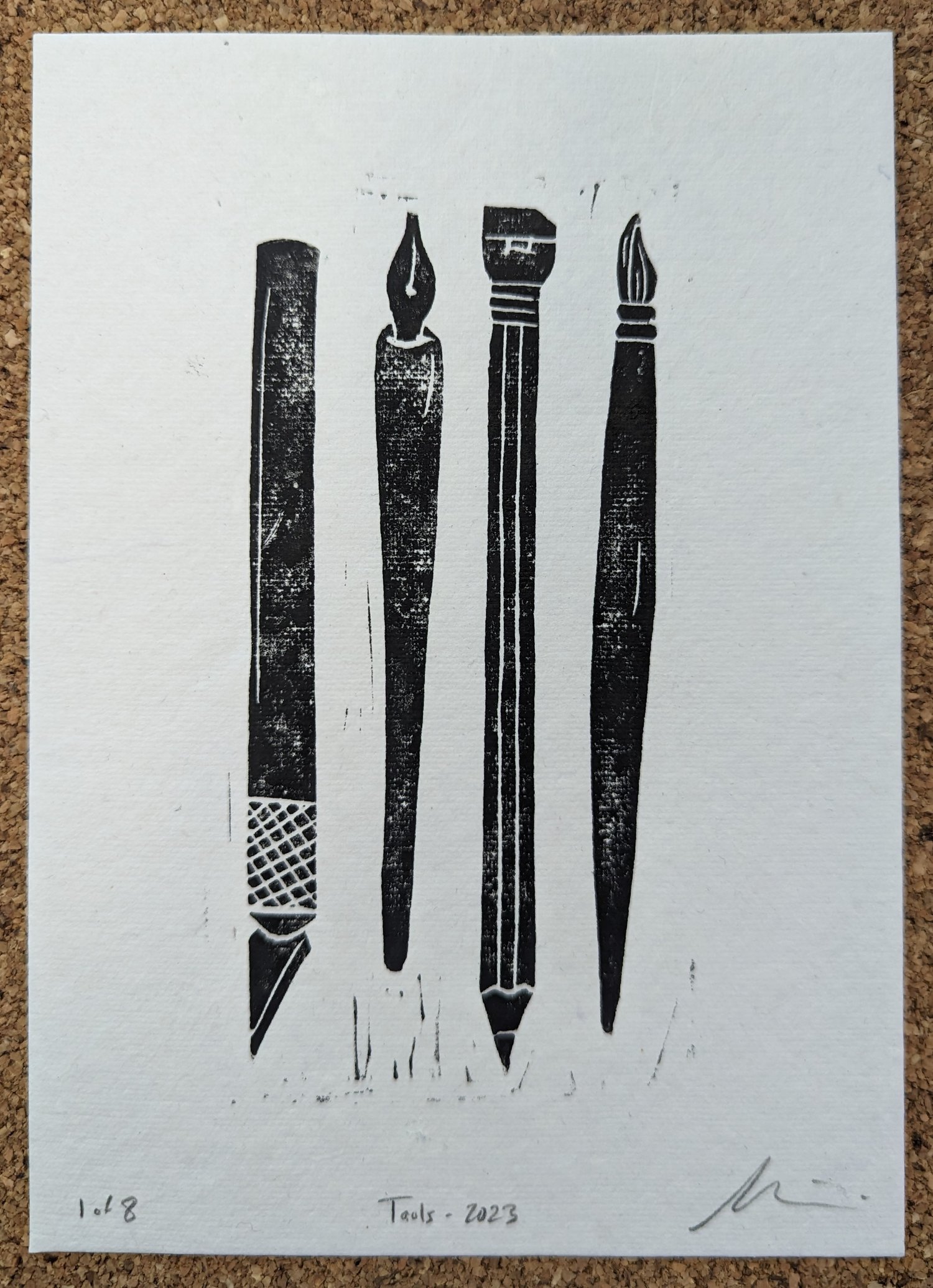 Consisting of an craft knife, a fountain pen, a Blackwing pencil, and a paintbrush this print is made by hand from hand-carved linoleum block and printed using oil-based ink onto 5"x7" 140 lb cotton rag paper.